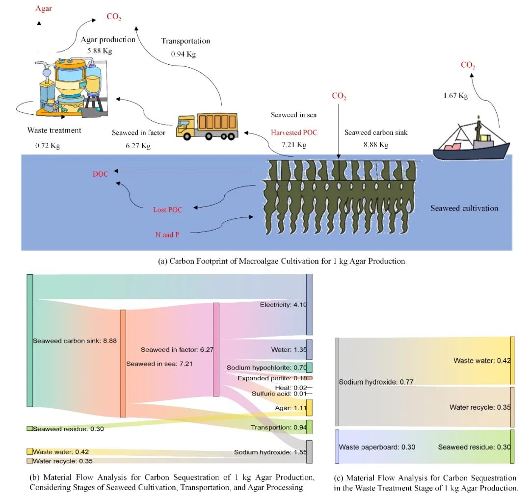 大型海藻栽培增汇在实现碳中和、缓解气候变化方面能够发挥较为重要的作用。该研究首次综合运用生命周期评估(LCA)和环境损益分析(EP&L)方法,对利用龙须菜(Gracilaria lemaneiformis)提取琼胶过程进行环境可持续性分析。